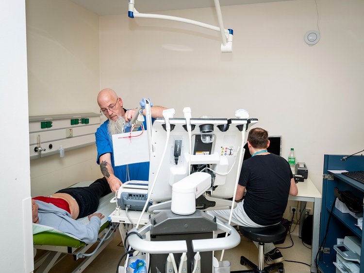 Der nächste Patient hat Bauchschmerzen, hierfür brauche ich ein Ultraschallgerät. Normalerweise habe ich eins in meiner Box, aber die diensthabende Internistin hat es in Gebrauch. Ich weiß, wo ich ein weiteres finden werde: im Schockraum. Der Weg führt mich vorbei an der „Obdachlosenecke“, die sowohl visuell als auch olfaktorisch von vielen Punkten der Rettungsstelle aus erkennbar ist. Heute liegen dort nur fünf Menschen, die meisten schlafen dort ihren Rausch aus. Im Schockraum angekommen, liegt mit einem Bettlaken bedeckt, eine Tote – auch das gehört hier dazu. Ich nehme das Gerät mit, führe den Ultraschall durch und finde nichts. Der Patient ist trotzdem erleichtert und geht zufrieden nach Hause. Gerade als ich bei einem weiteren Patienten einen Hautausschlag begutachte, kommt Rico herein. Er will wissen, ob ich etwas brauche. Ich grübele gerade und entscheide mich dann: Krätze. Unwillkürlich fangen wir an, uns zu jucken. Nein, hier brauche ich gerade nichts.