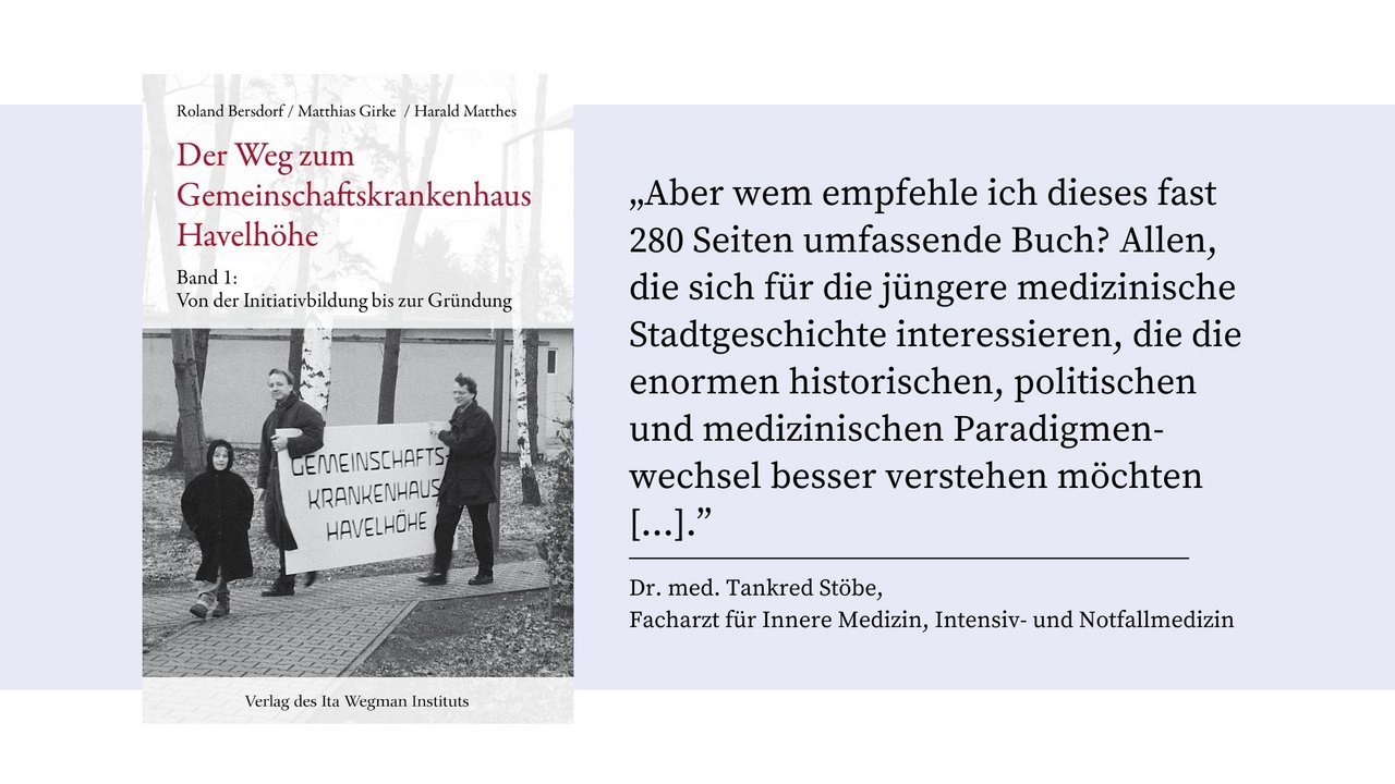 Aber wem empfehle ich dieses fast 280 Seiten umfassende Buch? Allen, die sich für die jüngere medizinische Stadtgeschichte interessieren, die die enormen historischen, politischen und medizinischen Paradigmenwechsel besser verstehen möchten, und natürlich auch allen, die wissen wollen, warum es dieses Gemeinschaftskrankenhaus überhaupt gibt. Vor allem aber sei die Lektüre all jenen ans Herz gelegt, die erfahren möchten, wie engagierte Menschen ein Reformkrankenhauskonzept in die Tat umsetzen. Bersdorf sagt dazu: „Ohne initiative Menschen, keine Initiative. Und ohne Unterstützung durch Menschen, die im gesellschaftlichen Kontext Verantwortung innehaben, kommt eine Initiative auch nicht zu einer Verwirklichung ihres Anliegens.“