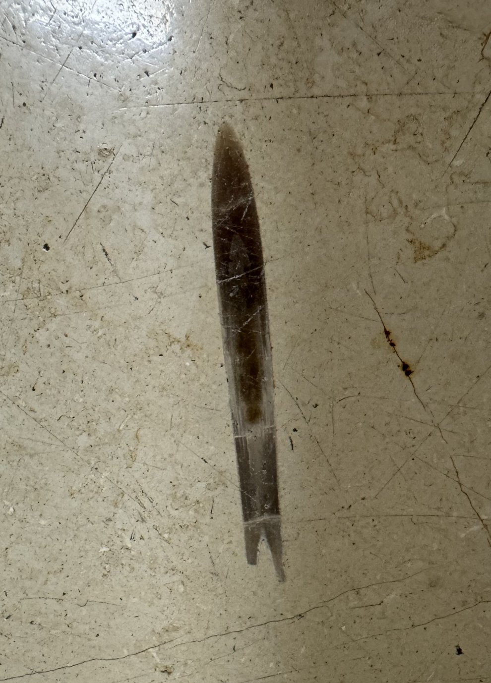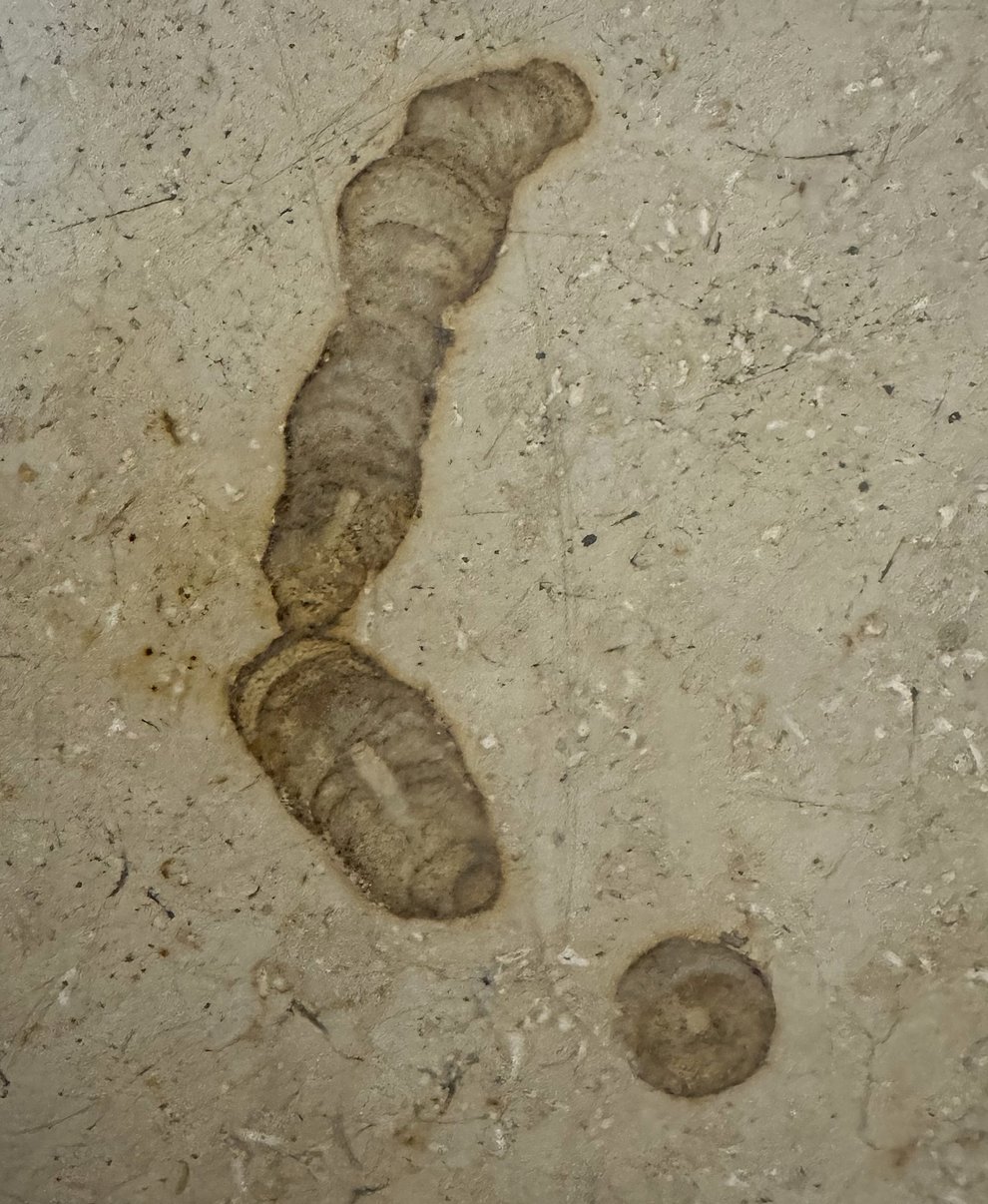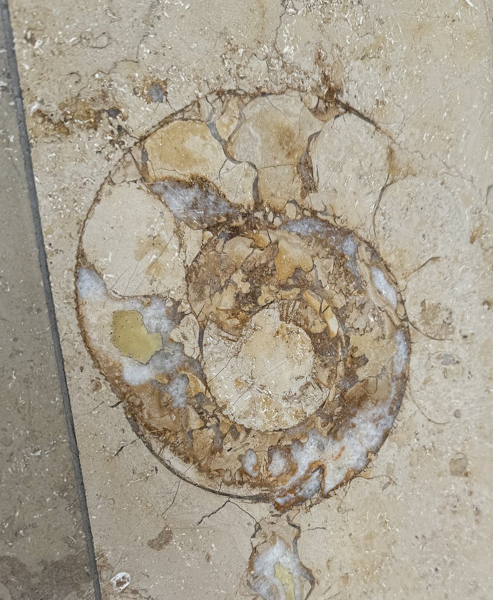 Ein weiterer fossiler Fund im Marmorboden lässt Raum für Spekulationen. Möglicherweise handelt es sich um einen Trilobiten, einen frühen Gliederfüßer aus einer Zeit, die noch deutlich vor der Jura-Epoche liegt. Eine weitere Möglichkeit wäre ein Nautiloide, ein früher Vertreter der Kopffüßer mit gerader oder leicht gebogener Schale. Sicher ist nur, dass dieses Lebewesen in einer Welt lebte, in der es die Medizin noch nicht gab und dennoch Leben in erstaunlicher Vielfalt entstand.